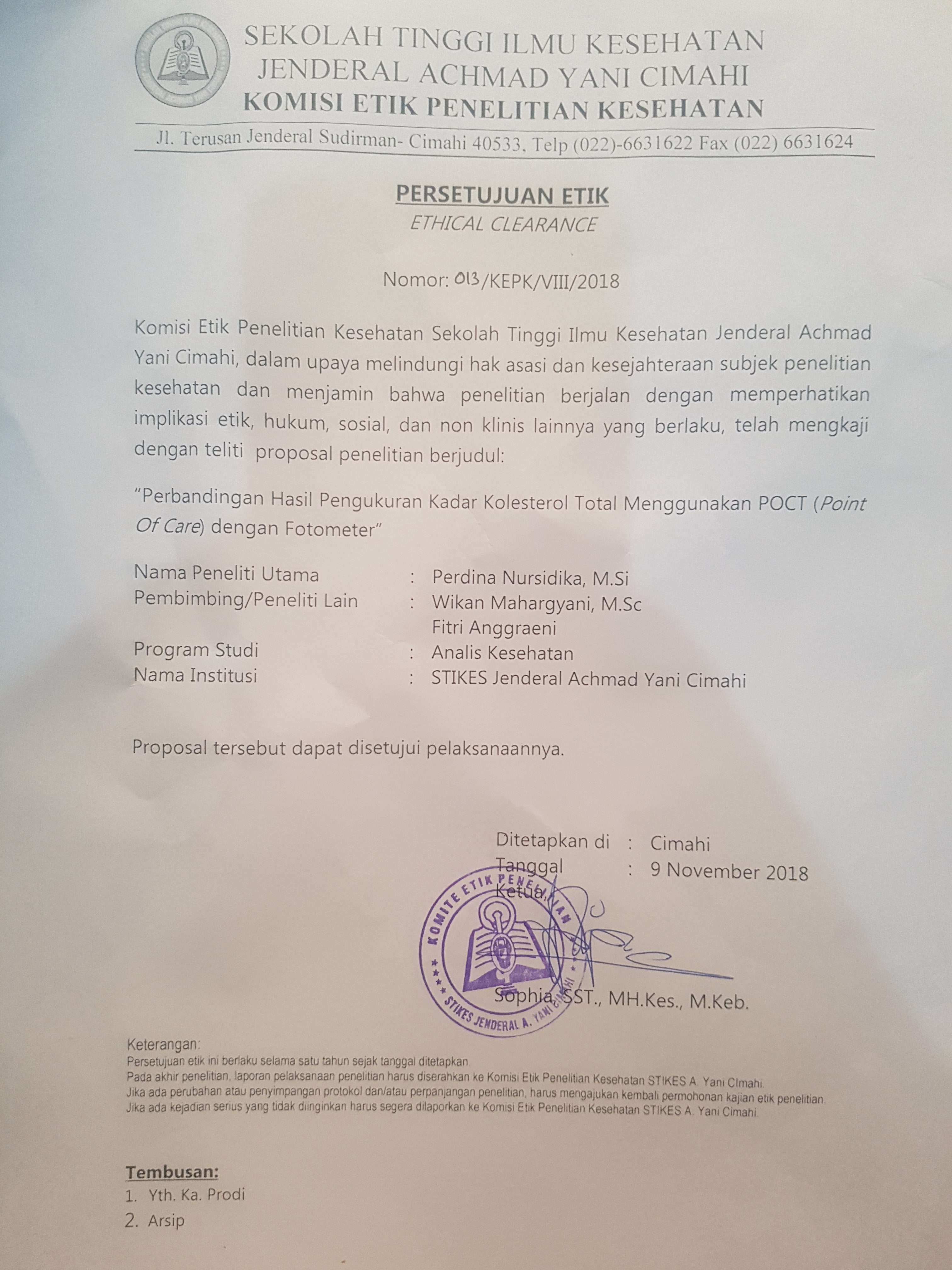 Total cholesterol is the composition of many substances including cholesterol, triglycerides, LDL cholesterol, and HDL cholesterol. Cholesterol examination is one of the most frequent tests required in the laboratory to monitor vascular and cardiovascular diseases. Most clinical pathology laboratories use photometer to perform clinical chemistry checks. Cholesterol testing can also be done with Point of Care Testing (POCT) which has a working principle of biosensor technology. This research method is experimental, using 40 samples that can represent normal and pathological levels. All samples will be checked for total cholesterol with a photometer of CHOD-PAP method and 3 POCT Lipid Pro. The results showed linear regression y = 0.955x + 1.8325 with R2 of 0.9955. The linear regression value is calculated by Total Error (TE), while the Total Error Allowable (TEa) cholesterol is 10%. The bias value is 0.31%, TE for normal level = 5.92% and TE for high pathological level = 3.00%, it can be stated the result of examination can be compared or accepted. The% TE value obtained is less than the TEa value of cholesterol. It can be concluded that the total cholesterol results examined by the photometer and LipidPro are comparable. For further research it is advisable to use a total cholesterol sample that has a value of more than 400 mg/dL.Downloads