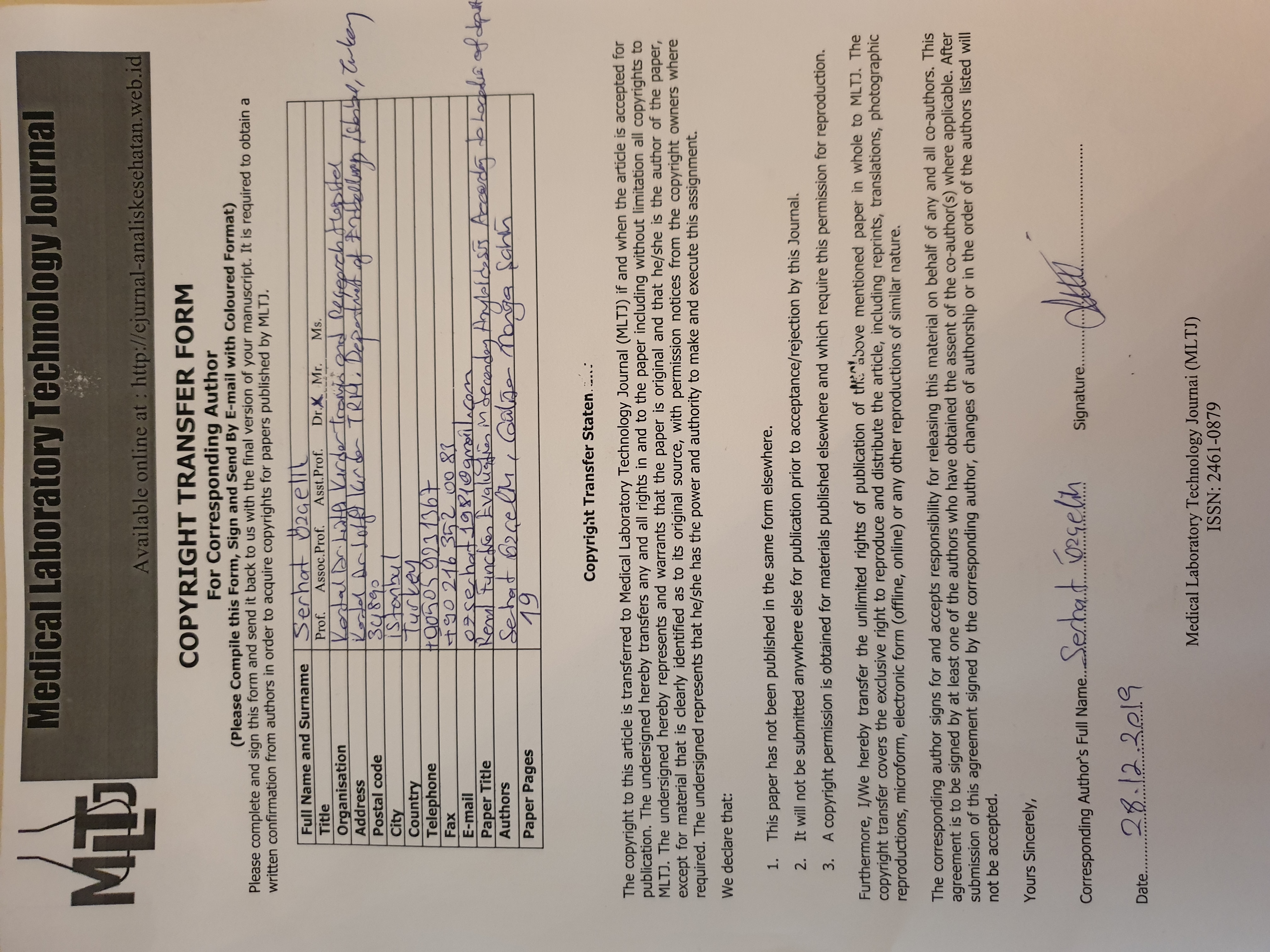 Publishing your paper with Medical Laboratory Technology Journal (MLTJ) means that the author or authors retain the copyright in the paper. MLTJ granted an author(s) rights to put the paper onto a website, distribute it to colleagues, give it to students, use it in your thesis etc, even commercially. The author(s) can reuse the figures and tables and other information contained in their paper published by MLTJ in future papers or work without having to ask anyone for permission, provided that the figures, tables or other information that is included in the new paper or work properly references the published paper as the source of the figures, tables or other information, and the new paper or work is not direct at private monetary gain or commercial advantage.